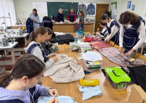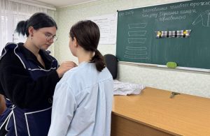 На виробничому навчанні 3 курс за професією «Кравець, закрійник» відпрацьовує тему «З’єднання коміра з горловиною».