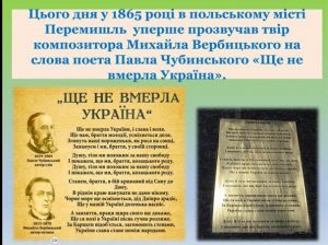 Під час заходу учасники дізналися про історію створення гімну, його авторів – Павла Чубинського та Михайла Вербицького. Особливу увагу було приділено історичному факту першого публічного виконання гімну 10 березня 1865 року в Перемишлі під час вшанування пам’яті Тараса Шевченка.